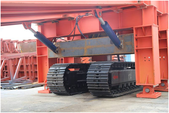 棧橋平移時,收起棧橋行走支架,將棧橋前后兩端支架支撐在地面上,放下行走支架,使前端支架脫離地面,控制前后端支架中的平移油缸,使棧橋橋身整體左右平移,把前后棧橋放置在地面上,運輸車輛即可在棧橋上通行,在棧橋下方進行仰拱的施工。由于主橋的跨度大可以同時進行仰拱的開挖和仰拱回填施工,出渣等。棧橋前進時,放下行走支架和后段行走驅(qū)動裝置,使前后端支架脫離地面,開動行走驅(qū)動馬達,使棧橋整體向前方移動到預(yù)定位置,行走驅(qū)動裝置采用橡膠輪胎行走,無需鋪設(shè)鋼軌,可適用于各種開挖方式和不同工況,并且可以隨時自由轉(zhuǎn)換,操作簡單、靈活,使用面極其廣泛。